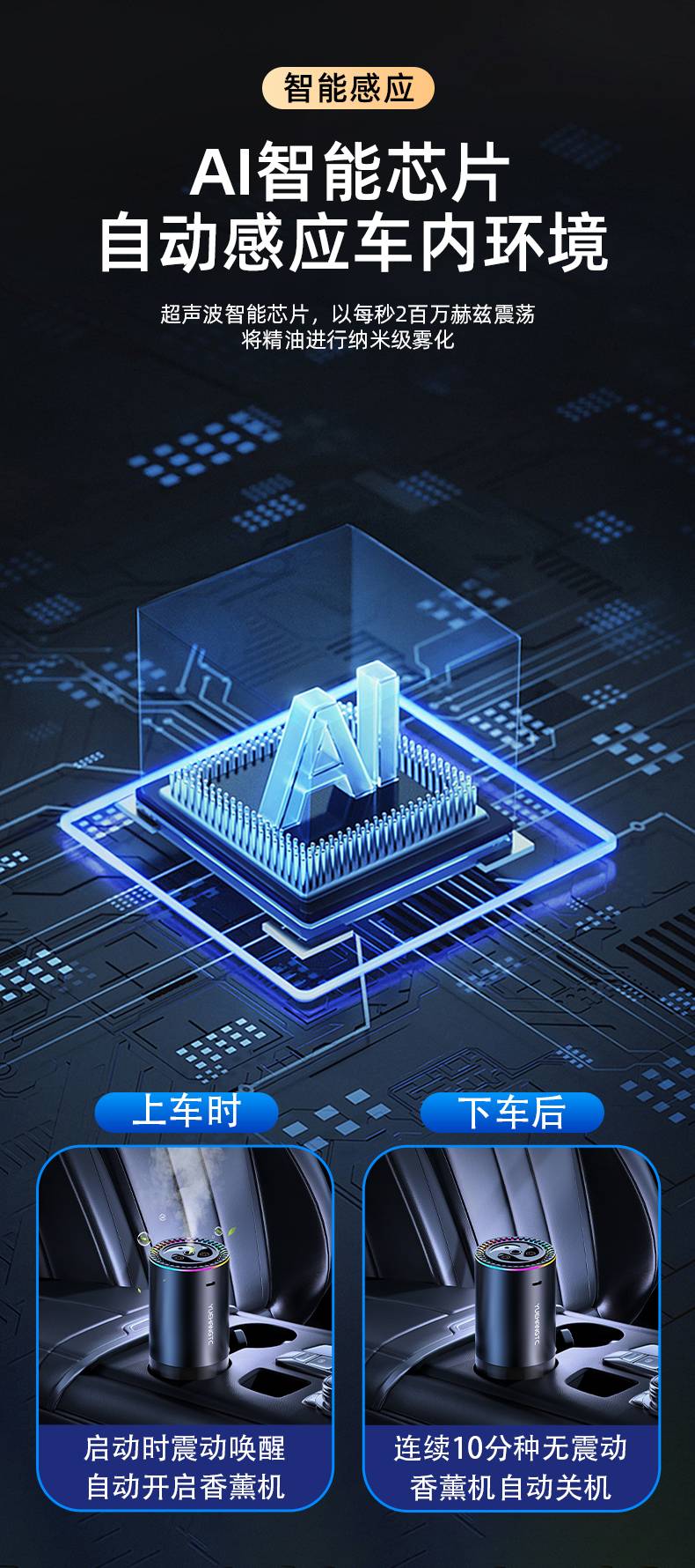 8. Chip cerdas AI penginderaan cerdas secara otomatis mendeteksi chip cerdas ultrasonik di lingkungan mobil, dan menyemprotkan minyak esensial pada skala nano dengan getaran 2 juta hertz per detik